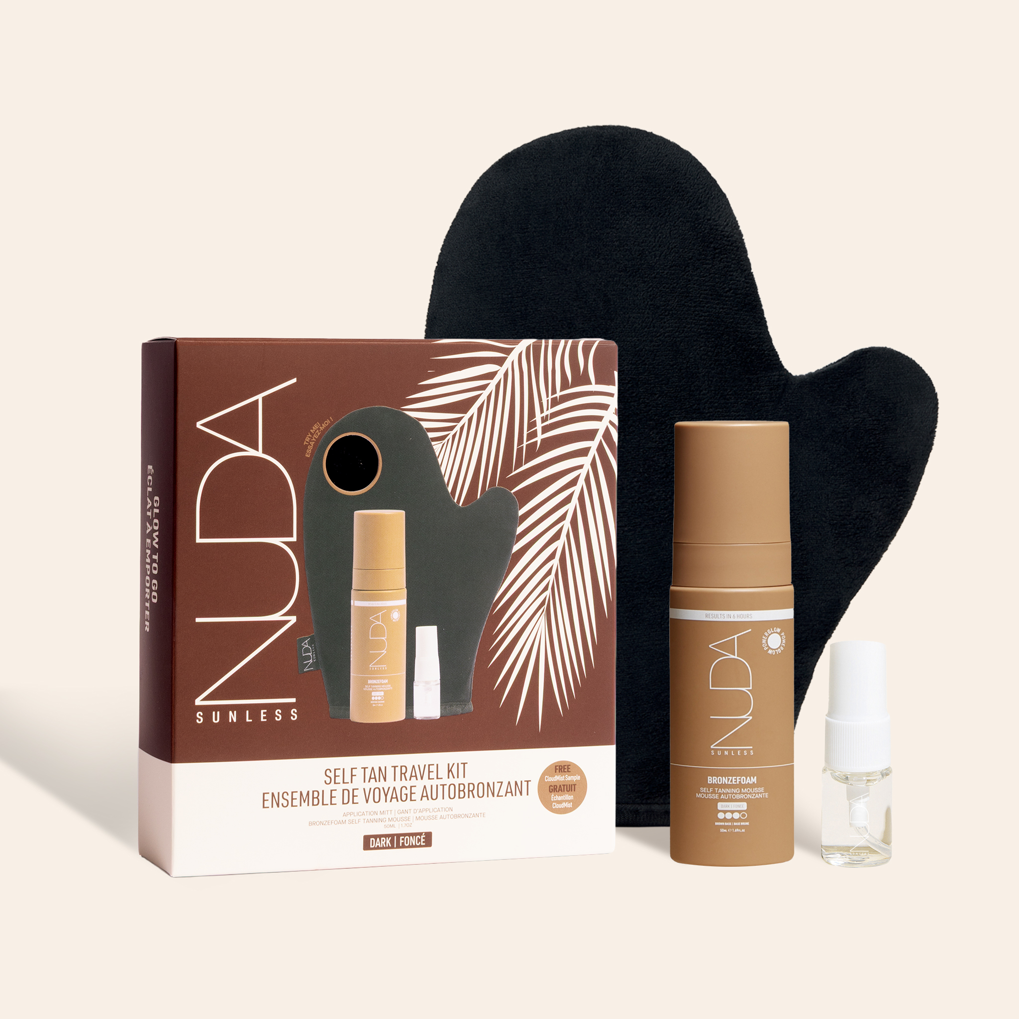Obtenez un teint bronzé de vacances grâce à nos essentiels autobronzants pour le voyage. Comprend : la mousse autobronzante BronzeFoam, l'eau autobronzante visage CloudMist et un gant de bronzage.
